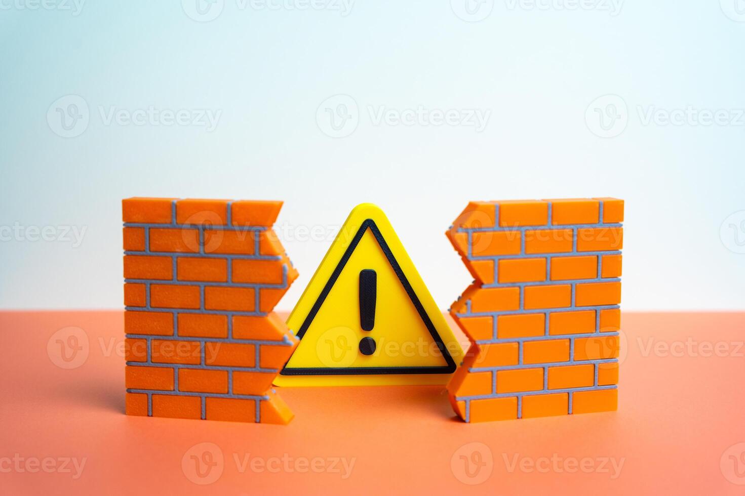 A warning sign bursts through a hole in the wall. A problem that destroys integrity. A warning about an error or malfunction that cannot be ignored for long. Cybersecurity, business risk assessment Pro Photo