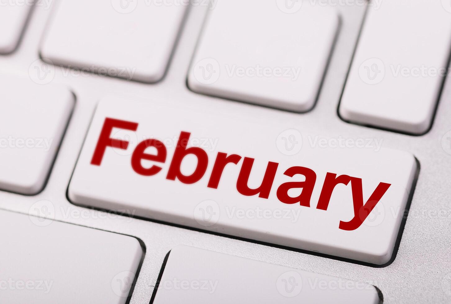 A close-up of a white computer keyboard key labeled February in red, symbolizing the second month of the year or digital scheduling. Pro Photo