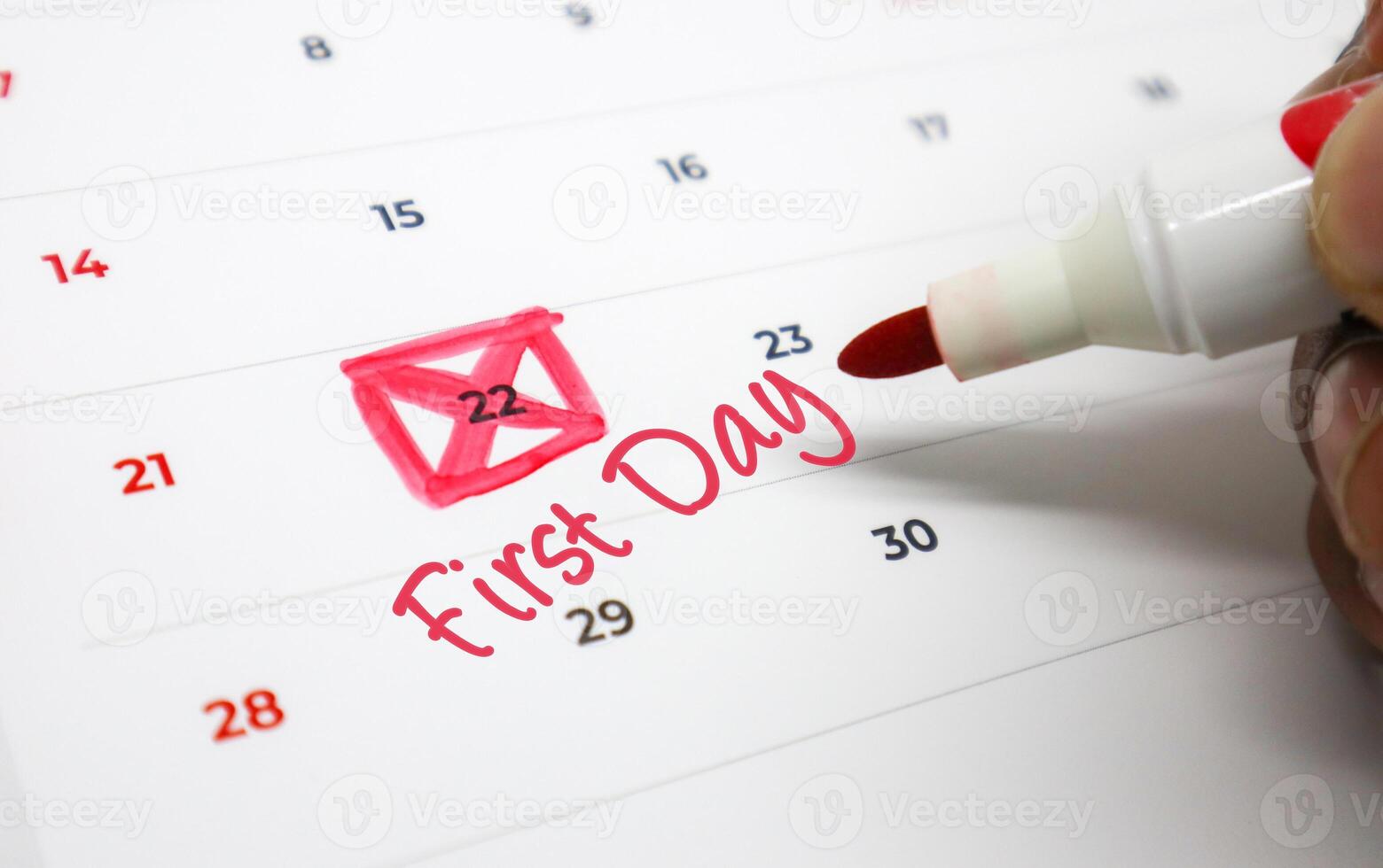 A hand uses a red marker to highlight an important date on a calendar, signifying a First Day or a new beginning and upcoming significant event Pro Photo
