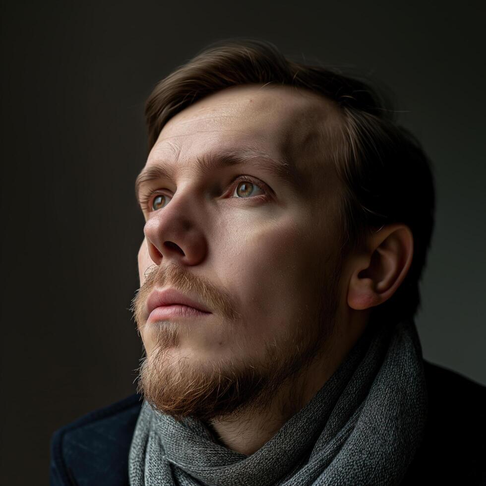 A Man Reflects Quietly, Dressed in a Scarf, Showcasing a Moment of Introspection in Soft Light photo