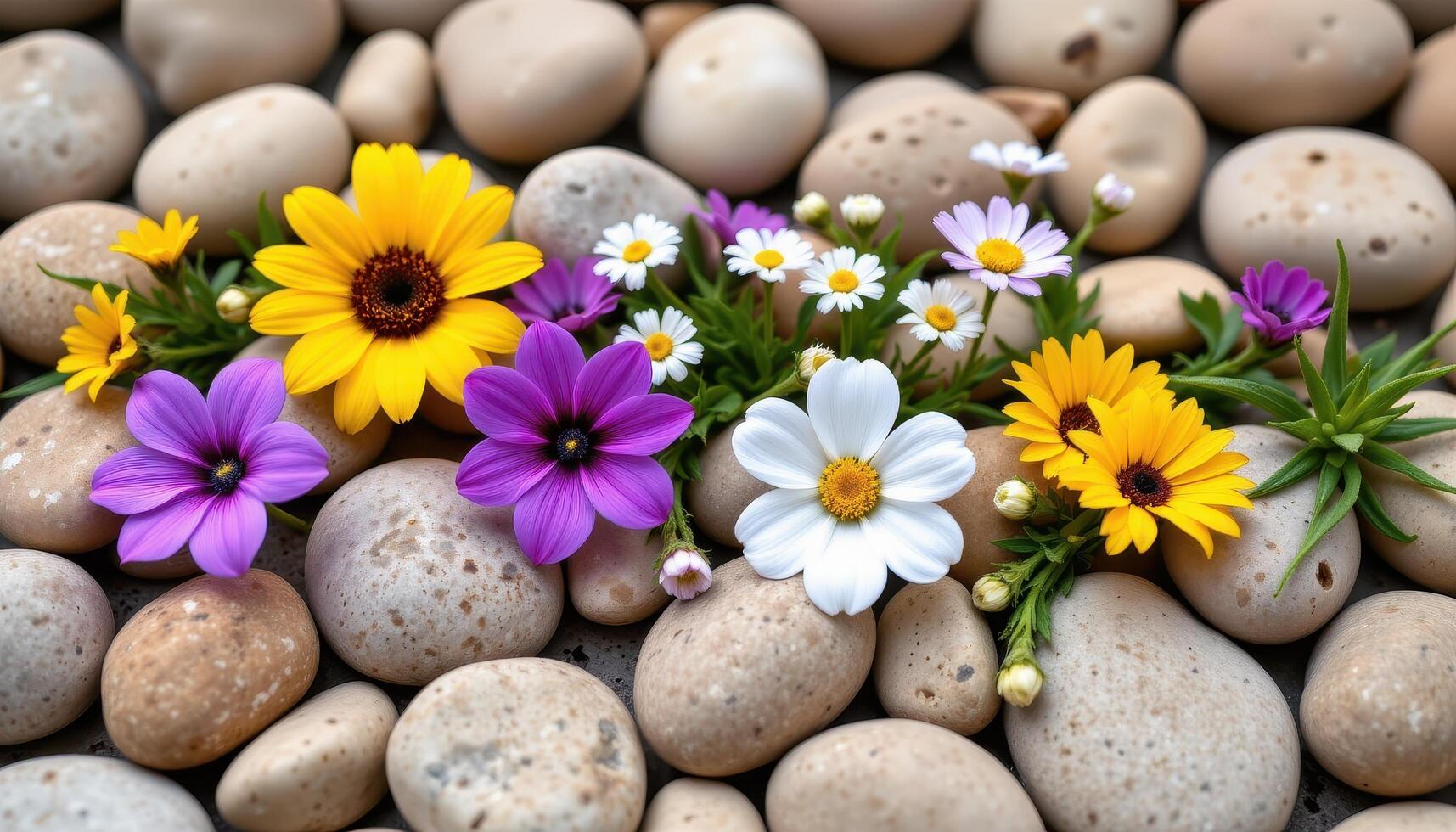 Wildflowers lying on smooth pebbles, creating a harmonious and calming natural arrangement. photo