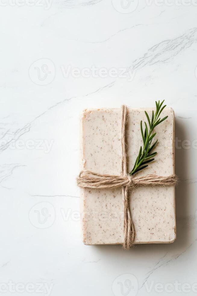 Handmade bar soap with twine and green sprig on white marble background. Natural soap is rectangular with a plant on a stone surface. Pro Photo