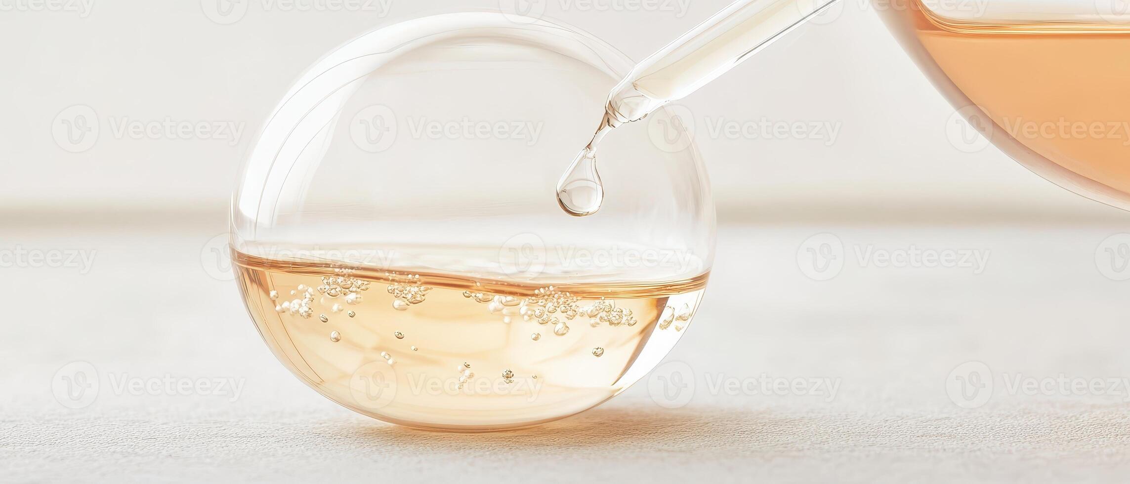 Droplet falls from pipette into spherical flask with bubbly liquid, creating a delicate chemical reaction. Pro Photo