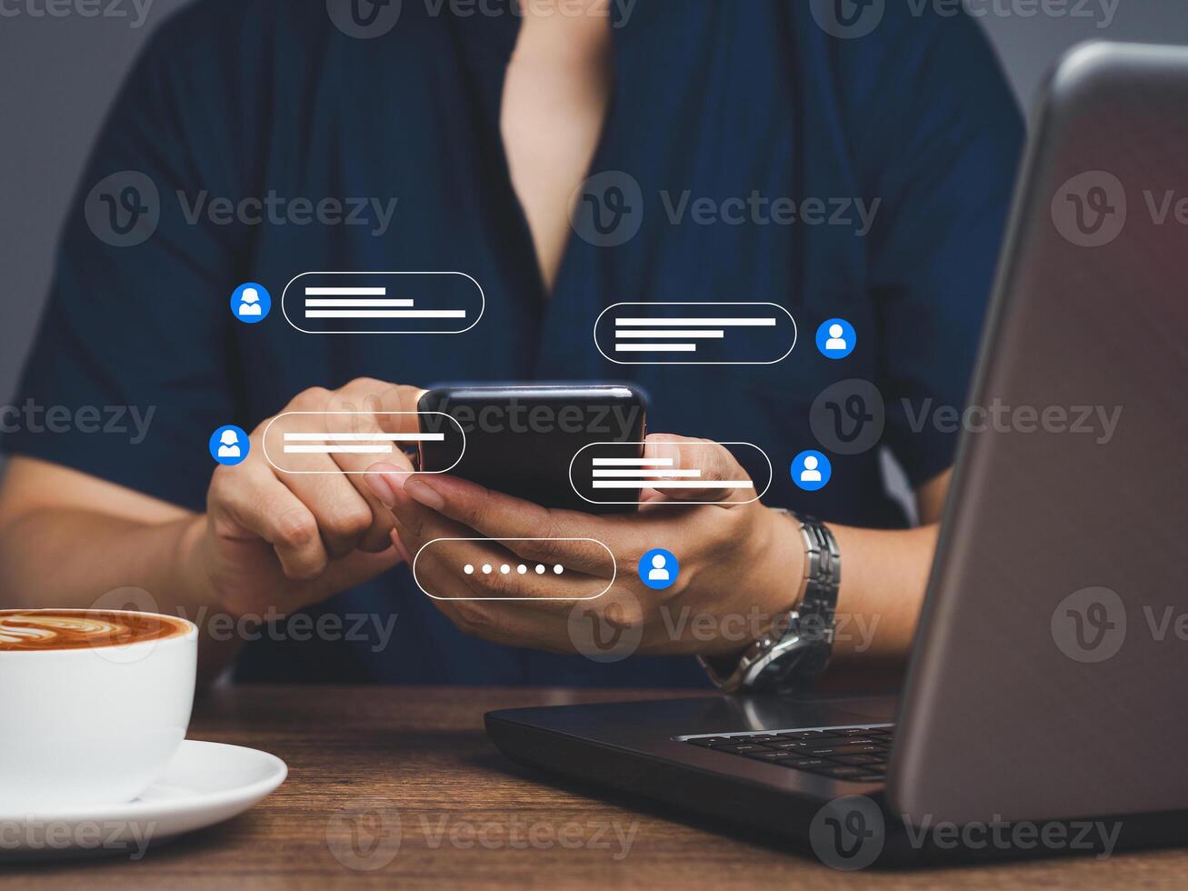 Man typing on a mobile phone with live chat chatting on application communication digital media websites and social networks. Pro Photo