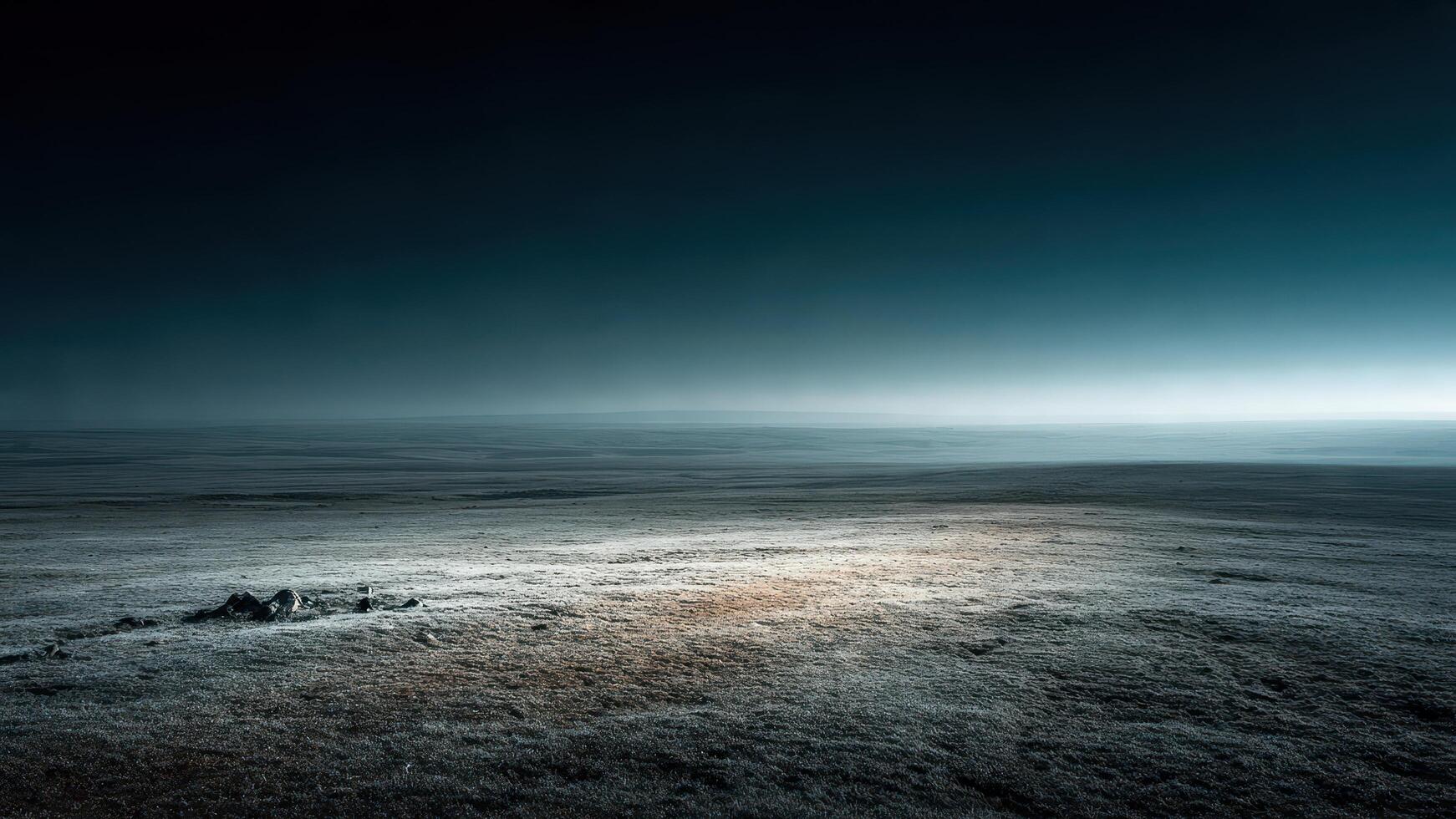 Desolate low lit wide open field under a dark moody vast blue teal gradient sky photo