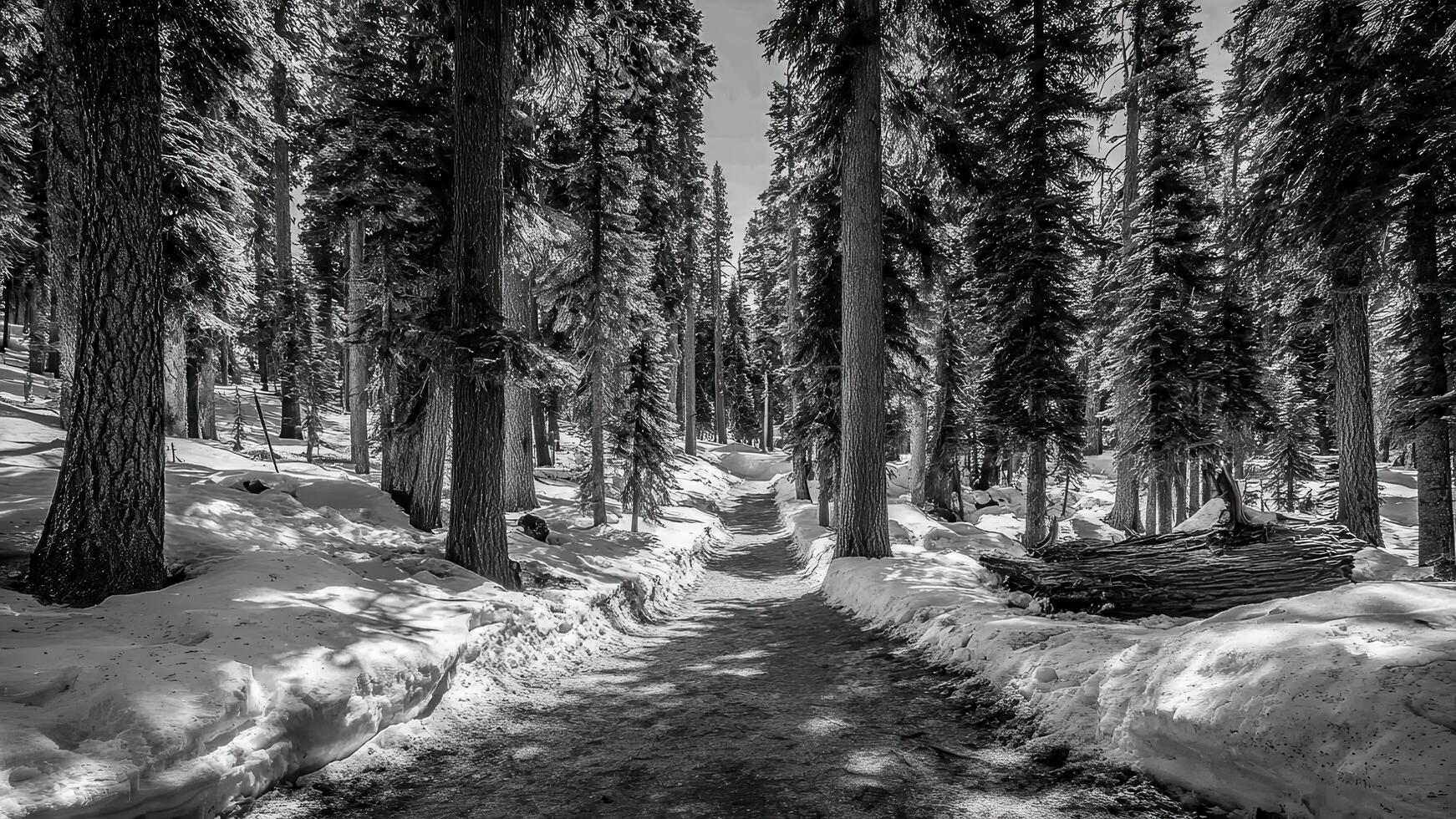 Black and white image of a winding snowy path through a dense forest of tall evergreen trees Free Photo