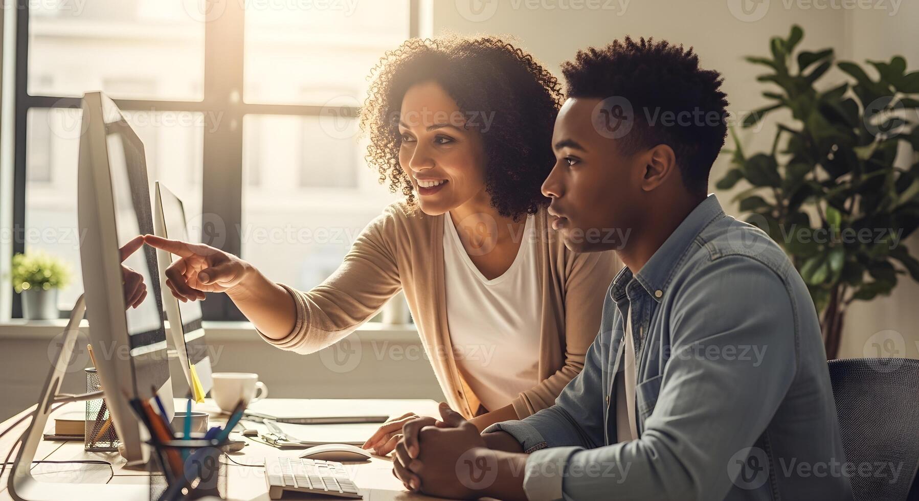 Diverse colleagues working together in a modern office, collaborating on a project, showcasing teamwork and productivity, at computers Pro Photo
