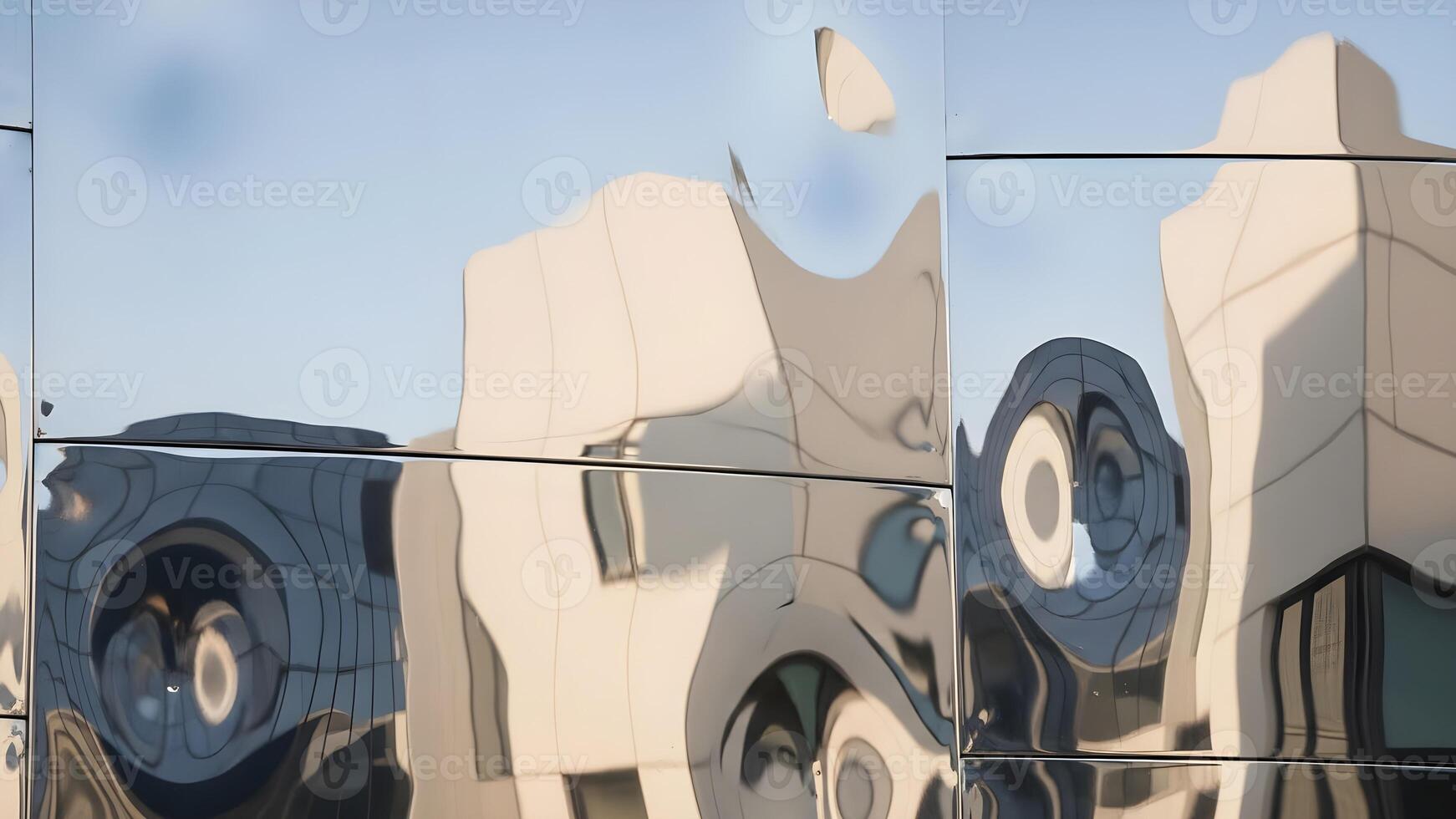 A distorted reflection of a building is shown on a mirrored surface. Pro Photo