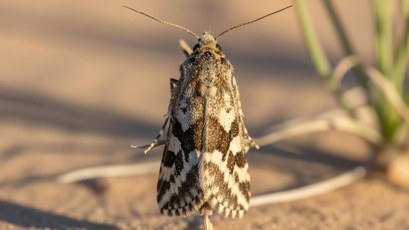 Macro shot of a moth with intricate wing patterns resting on a dry twig in the desert Free Photo