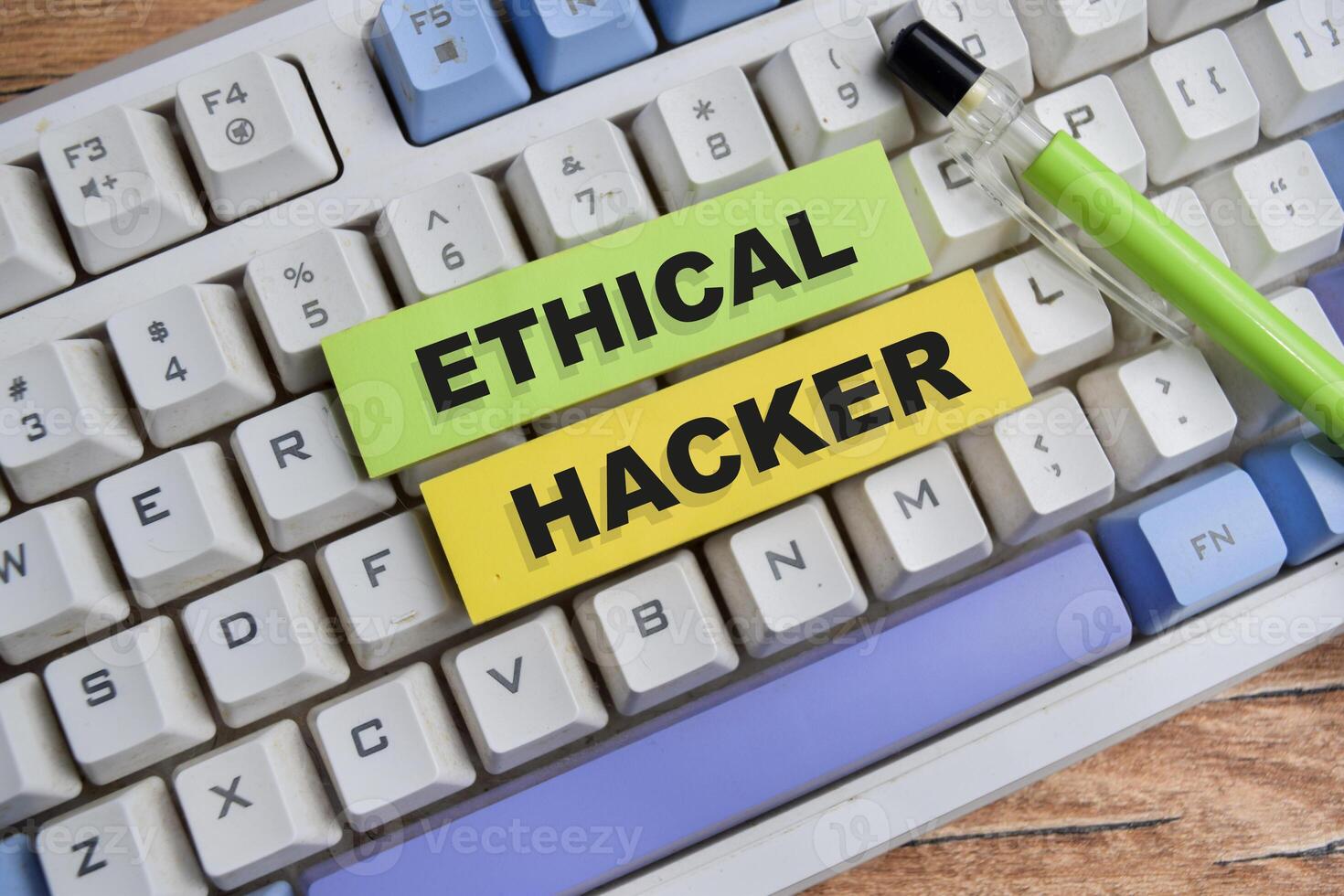 Concept of ethical hacker write on sticky notes isolated on Wooden Table. Pro Photo