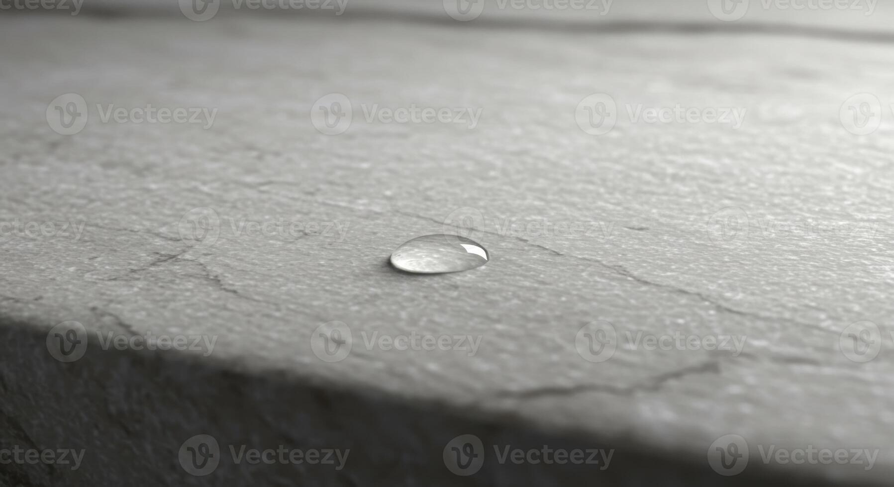 A single clear water droplet sits undisturbed on a textured gray stone surface with soft natural lighting creating subtle shadows and depth. Pro Photo