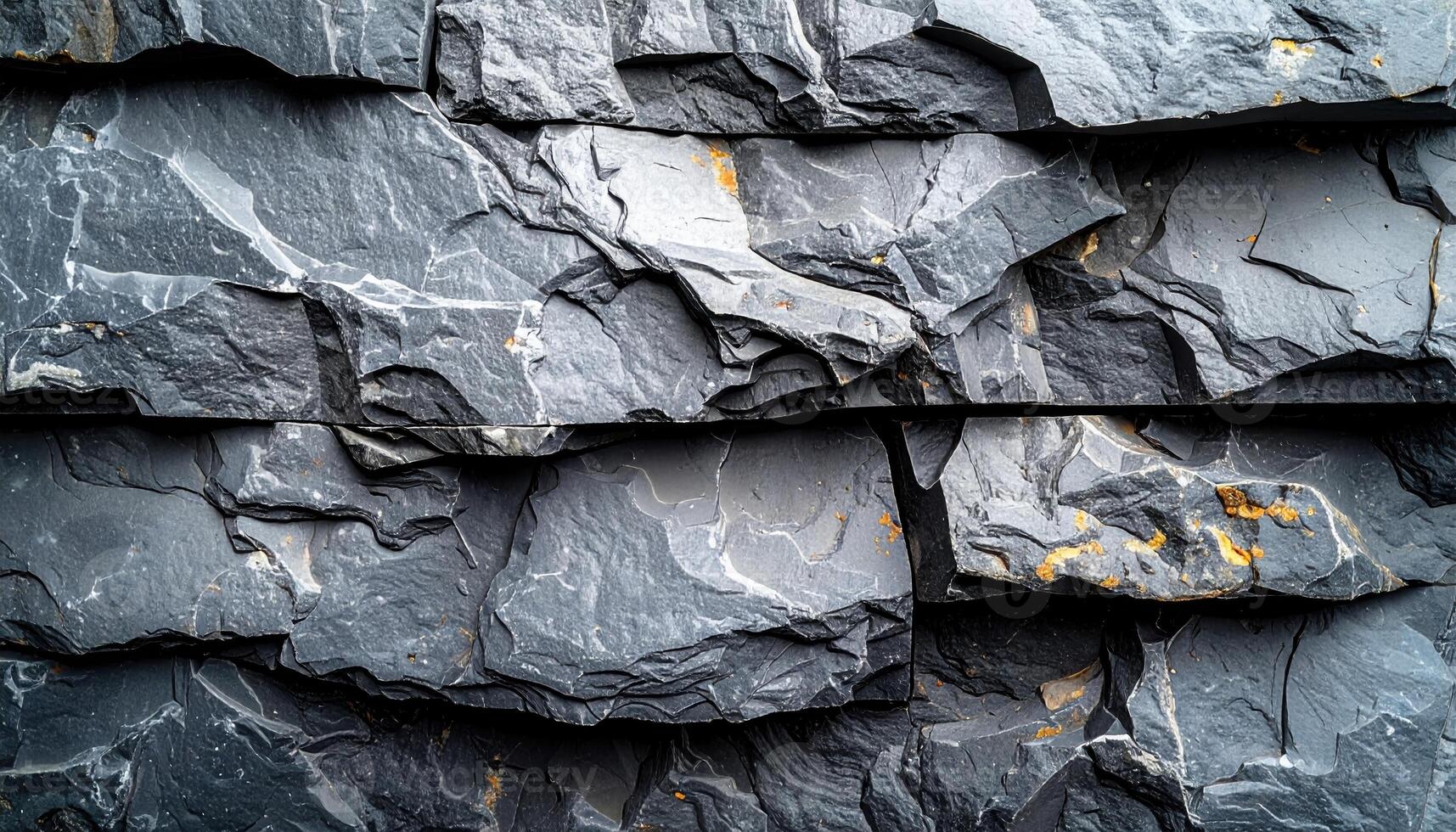 Close up shows the textured surface of a stacked dark gray stone wall creating a rugged and interesting architectural background element. Pro Photo