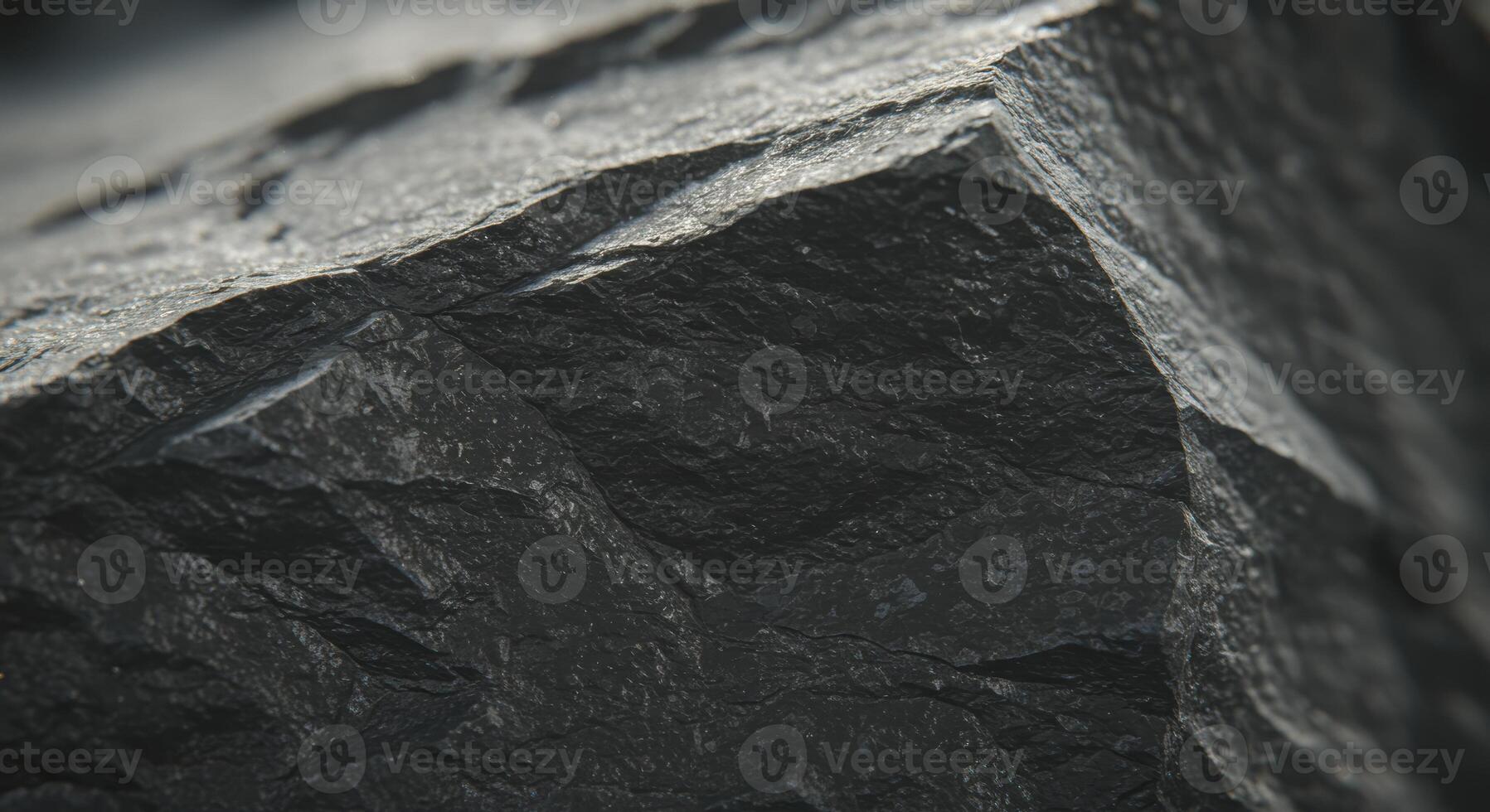 Close up of a dark grey stone surface showing its rough texture and edges illuminated by soft natural light to enhance details. Pro Photo