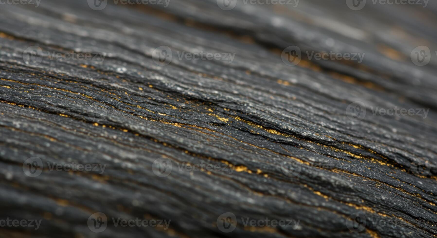 Close up texture of layered sedimentary rock formation showing dark grey strata with thin golden veins running through the stone layers . Pro Photo