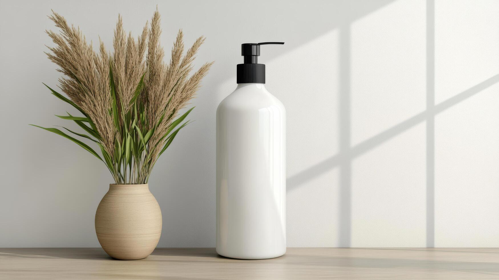 A bottle of soap and a vase of reeds on a wooden table 3d rendering Free Photo