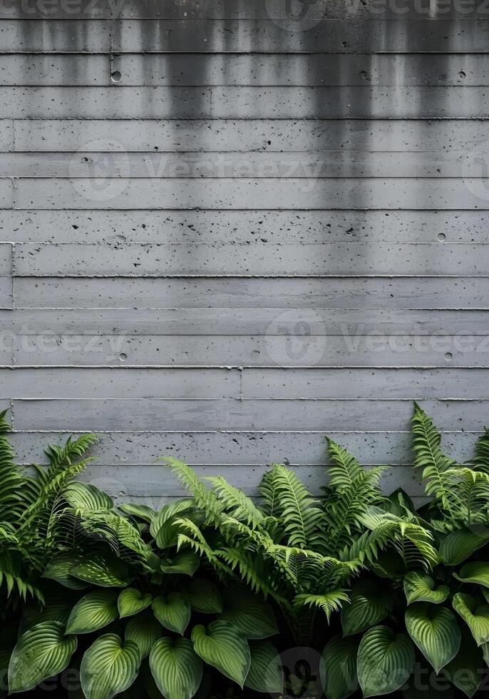 Contrasting Textures of Rough Concrete and Lush Greenery Background for Architectural and Botanical Themes with Ferns and Hostas Pro Photo