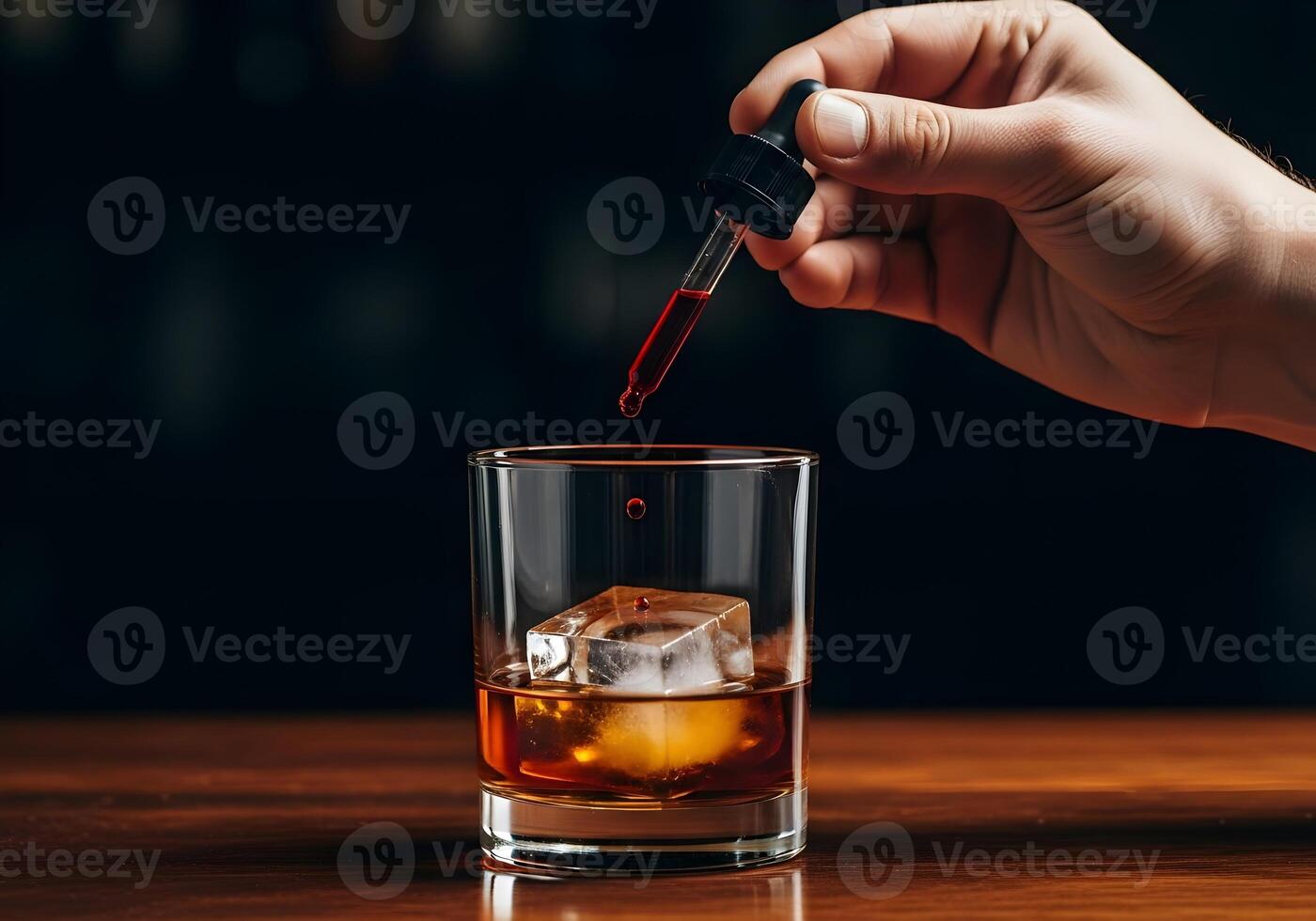 Crafting an Old Fashioned Cocktail with Precision A Close Up of a Bartender Adding Bitters to a Whiskey Drink with Ice Pro Photo