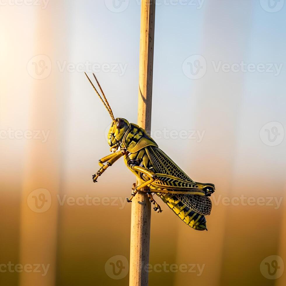 Detailed Macro Shot of a Grasshopper Resting on a Stem Capturing its Intricate Patterns and Textures in Natural Sunlight with a Blurred Background Pro Photo