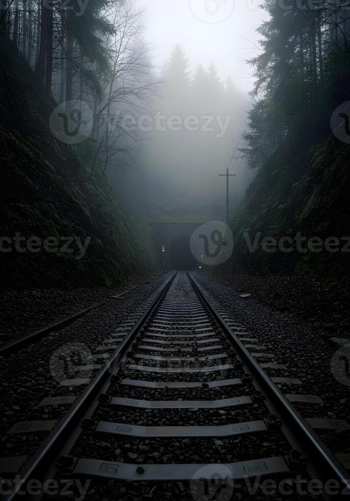 Mysterious Railway Tracks Leading into a Dark Tunnel Through Foggy Forest Landscape with Moody Lighting and Overcast Sky Creating a Sense of Journey Pro Photo