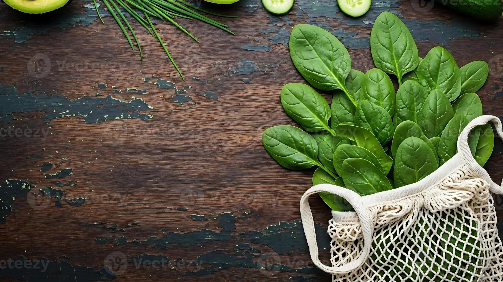 Fresh Spinach in Reusable Mesh Bag on Rustic Wood Table with Avocado and Cucumber Slices Pro Photo
