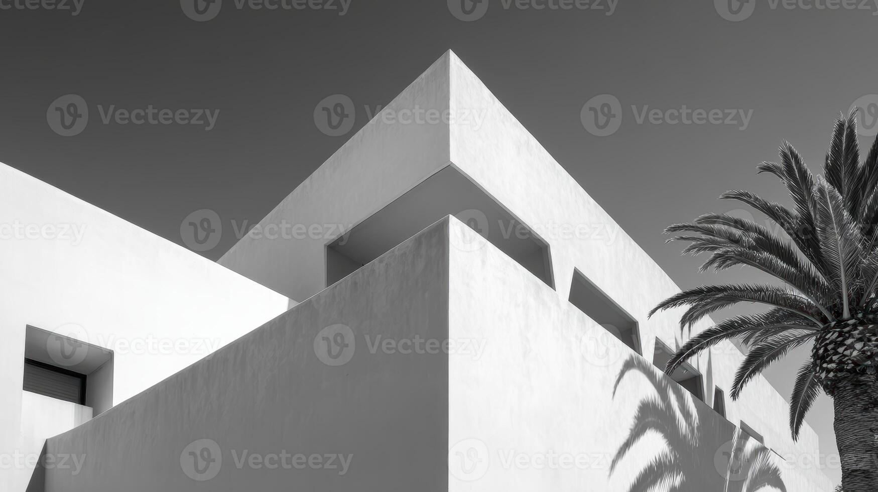 Modern white architecture with palm tree in bright sunlight Pro Photo