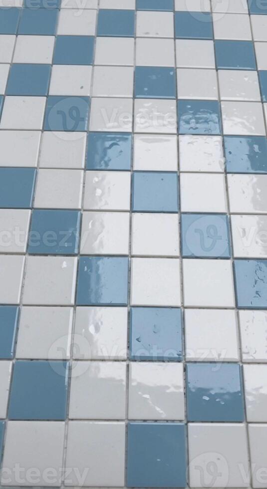 A close up view of a checkered pattern of small rectangular tiles in alternating shades of blue and white creating a clean modern surface Pro Photo