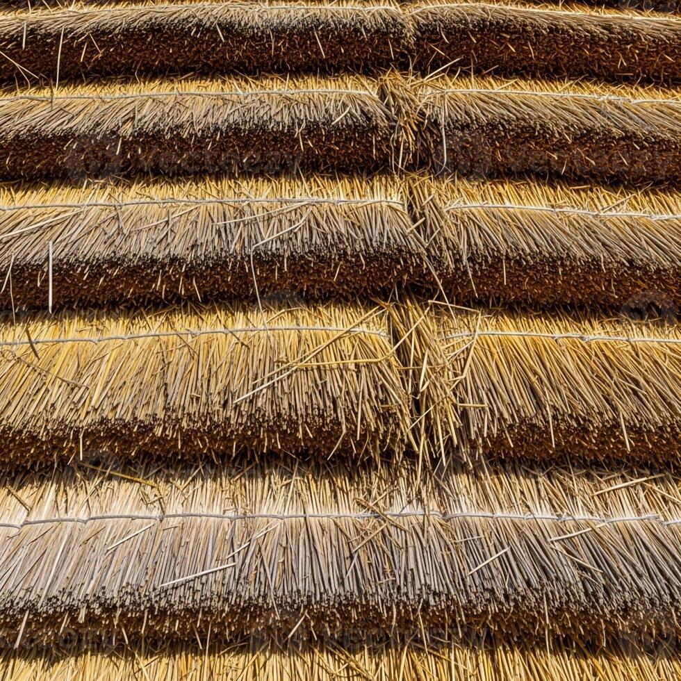Close up view of a textured thatched roof showing layers of dry straw and natural fibers creating a rustic pattern Pro Photo