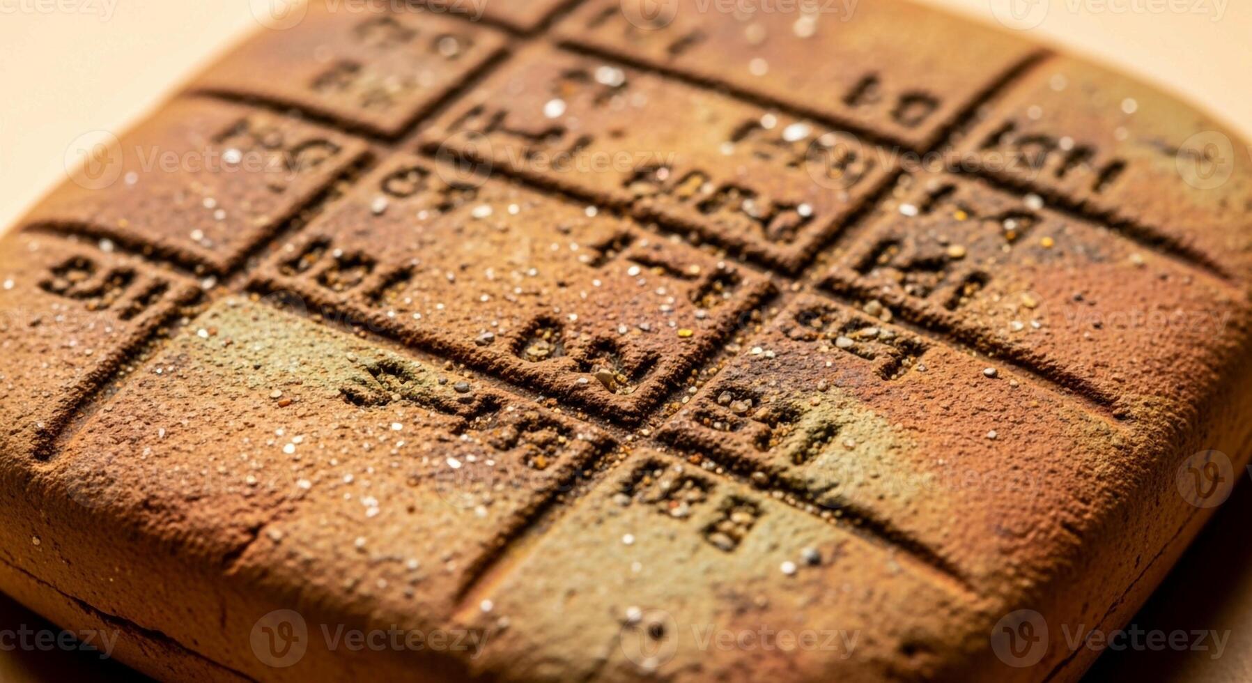 Close up macro view of a textured golden brown bread roll with a grid pattern and stamped markings Pro Photo