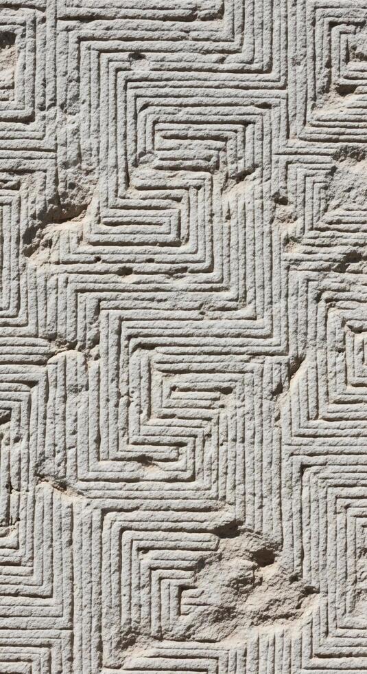 Intricate geometric pattern carved into textured stone surface with repeating labyrinthine design Pro Photo