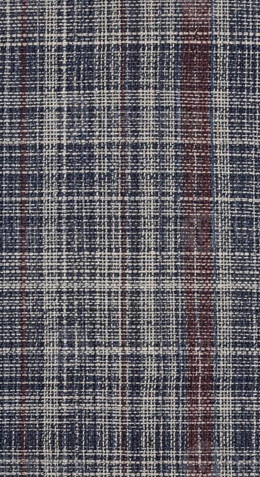 Close up texture of a woven fabric with a subtle plaid pattern featuring dark blue and white threads and a single vertical red stripe Pro Photo