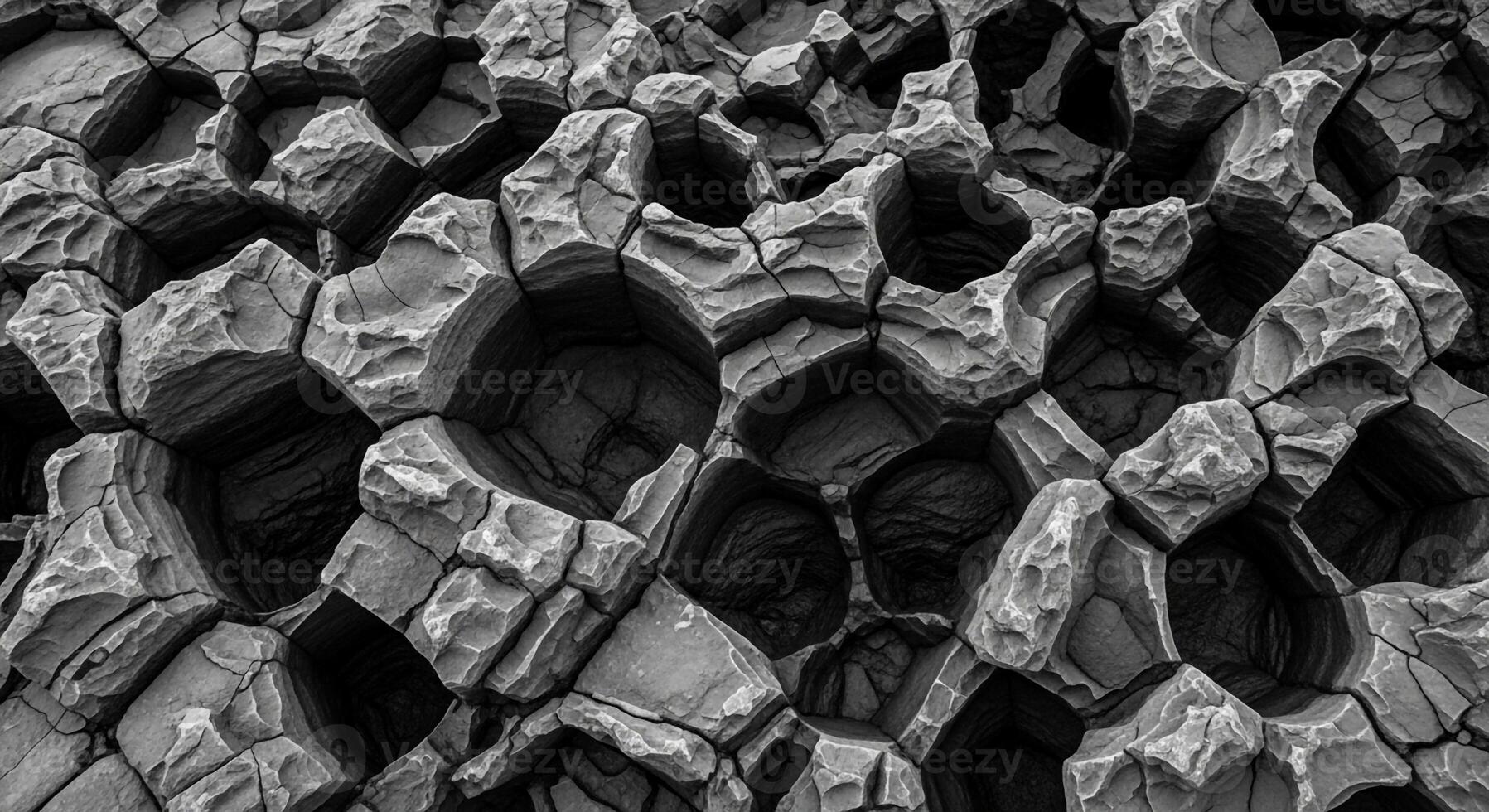 Close up abstract view of natural basalt columns forming a geometric honeycomb pattern in grayscale Pro Photo