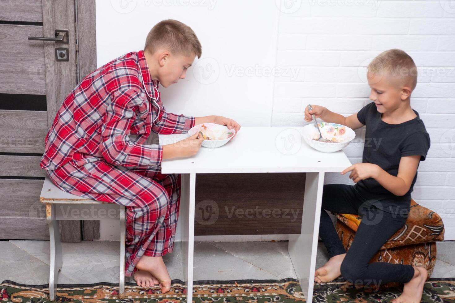 Two young boys are enjoying a meal together at a small, white table, creating a cozy and intimate setting for their shared dining experience. Pro Photo