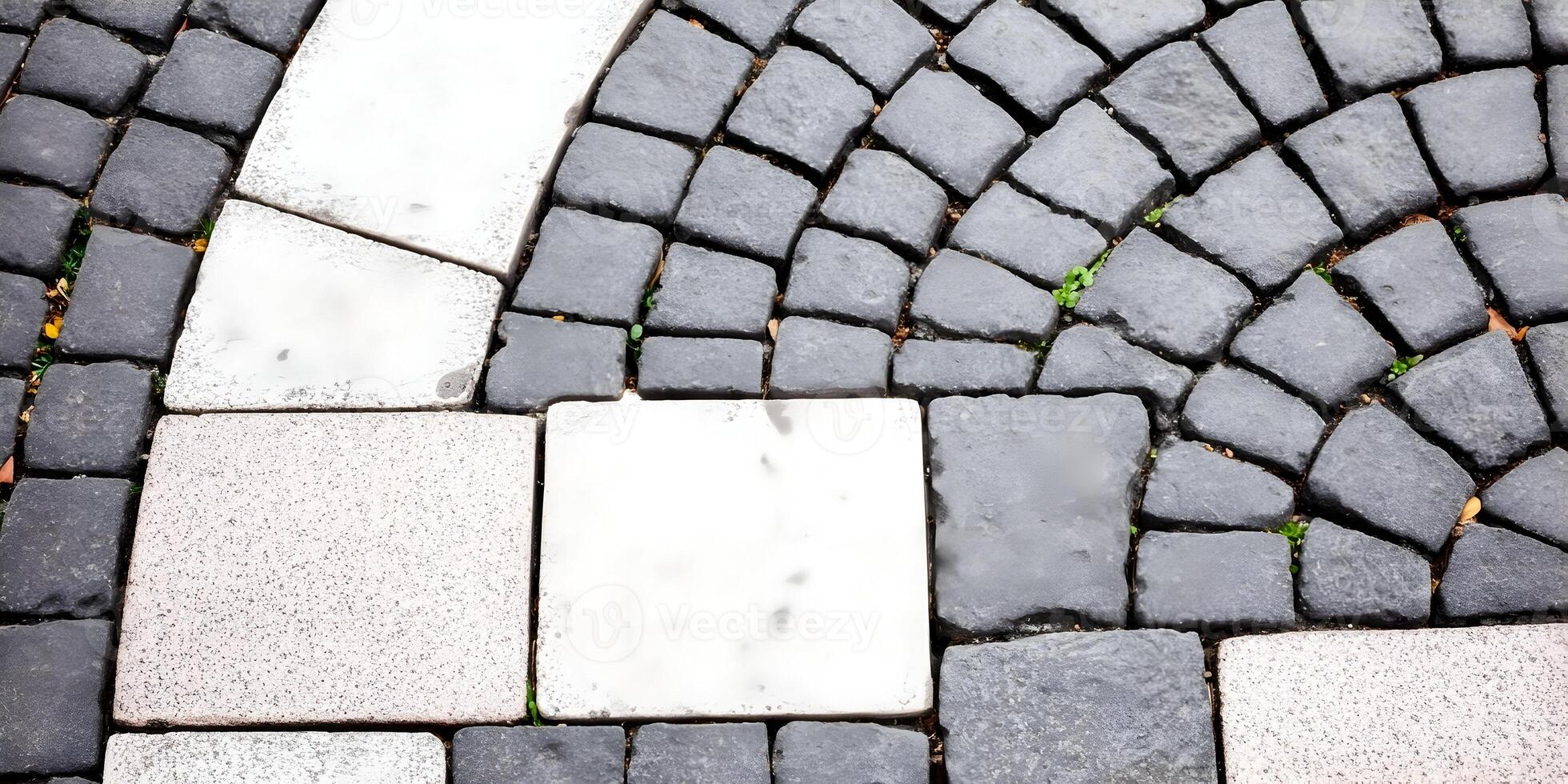 A close up view of an old stone pavement with grey and light grey interlocking stones arranged in a pattern Pro Photo