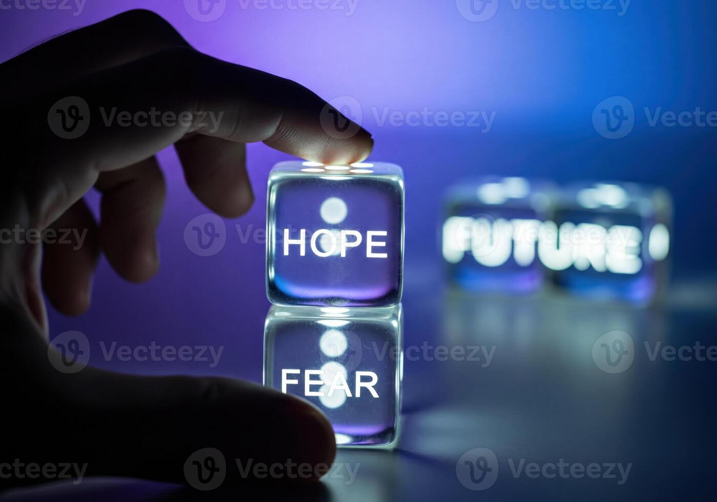 Hand on stacked dice showing 'HOPE' and 'FEAR', representing choices for the future Pro Photo