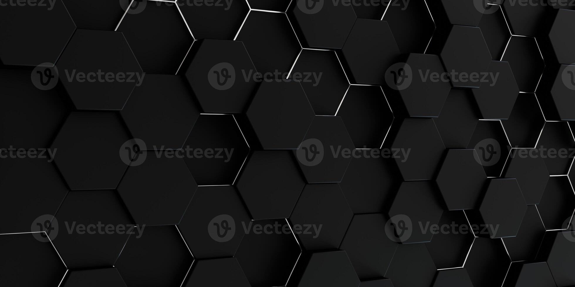 A high-contrast, dark abstract background showcasing a deep three-dimensional hexagonal grid of matte black tiles outlined by subtle, sharp silver light. Pro Photo