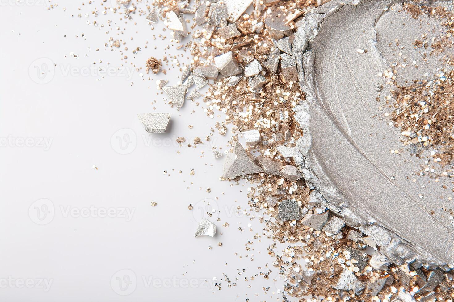 Metallic silver glitter and shiny fragments are scattered across a white surface, creating a vibrant display of sparkle and texture. The scene showcases clean lines and bright reflections Pro Photo