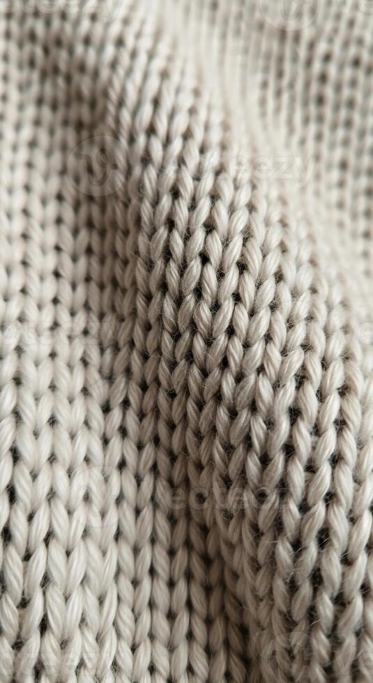 Closeup view of soft knitted fabric texture in a neutral color showcasing intricate weaving patterns and cozy material. Pro Photo