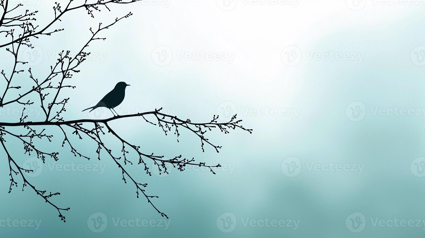 A solitary bird sits on a bare branch in soft fog, creating a tranquil and minimal scene at dawn Pro Photo