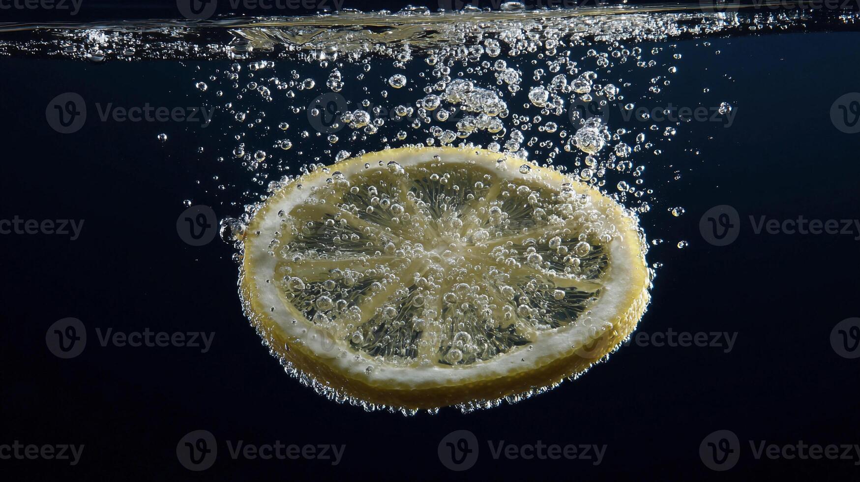 Lemon slice submerged in water creating bubbles in dark background Pro Photo