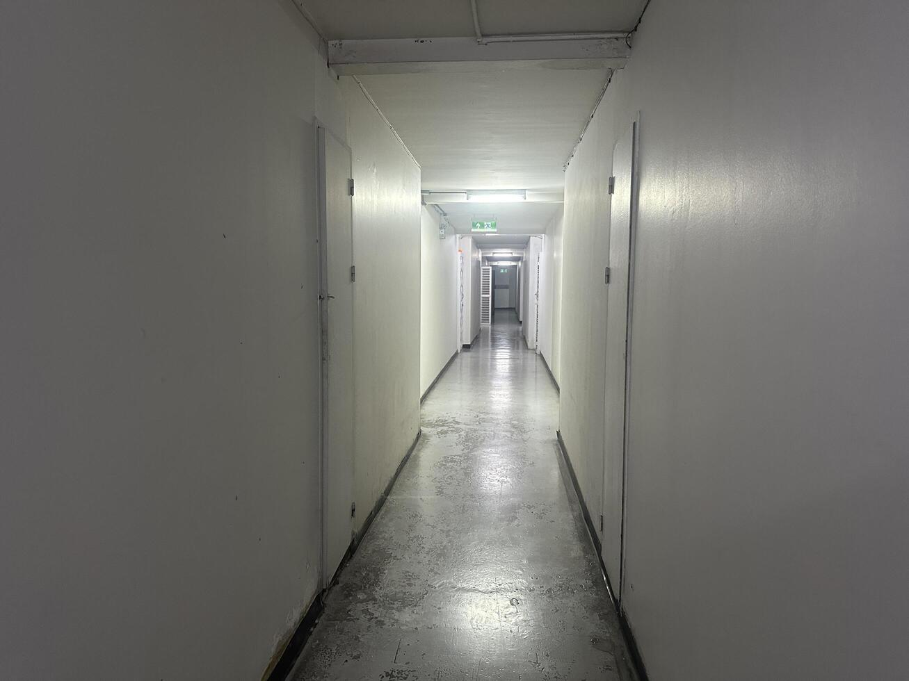 Long and Empty Hallway with Bright Lights and White Walls in a Modern Building, Ideal for Use in Architectural or Interior Design Projects photo