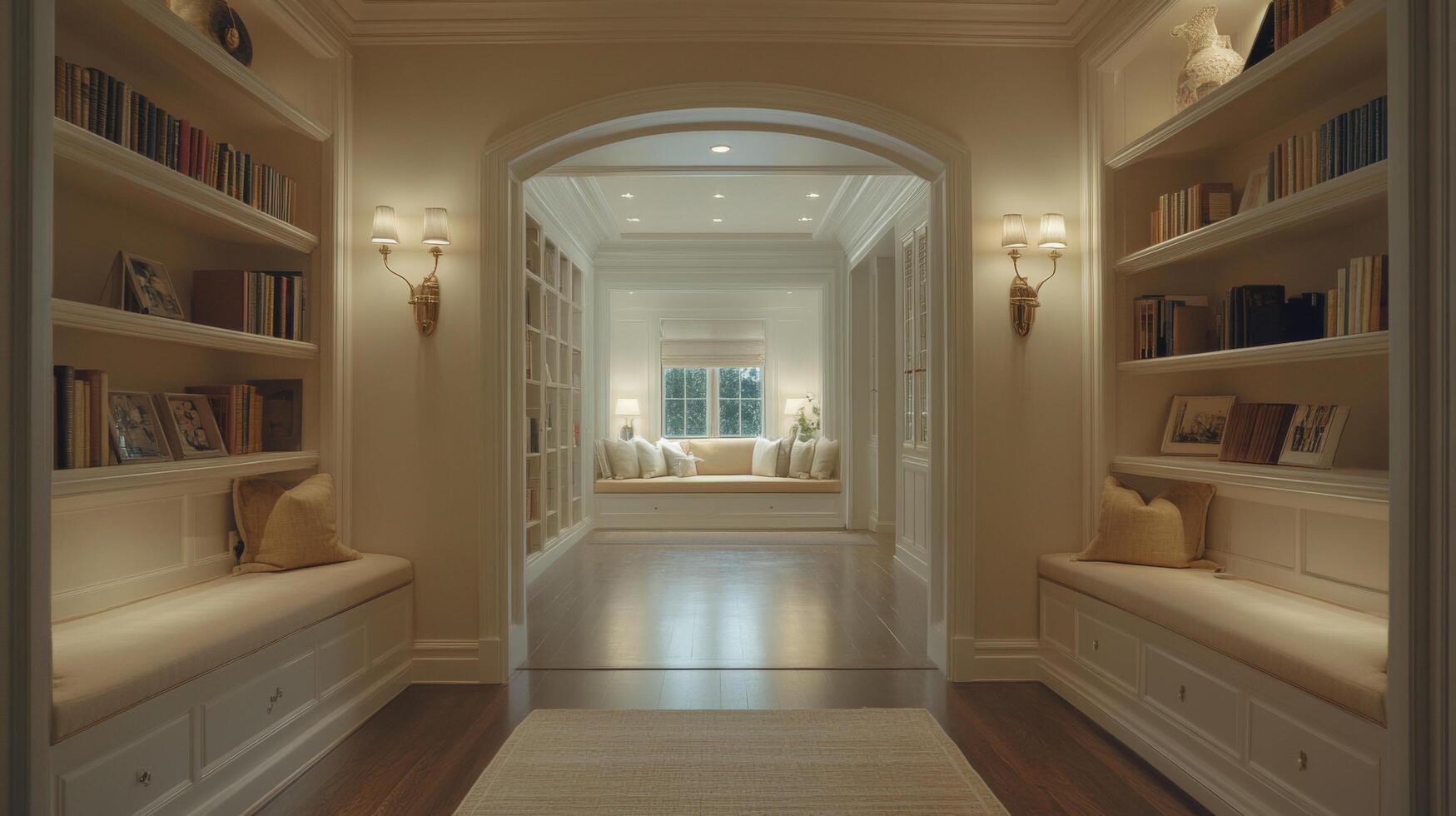 A serene hallway lined with bookshelves, soft lighting, and a comfortable reading nook at the end, creating an inviting space photo