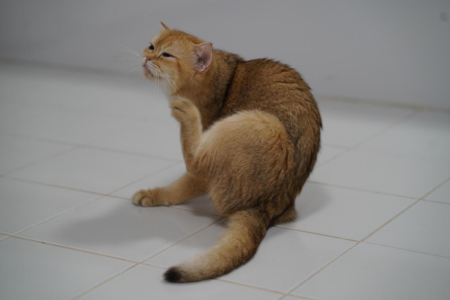 Cute ginger cat scratching its ear while sitting on a clean tiled floor with a curious expression in a well-lit indoor environment photo