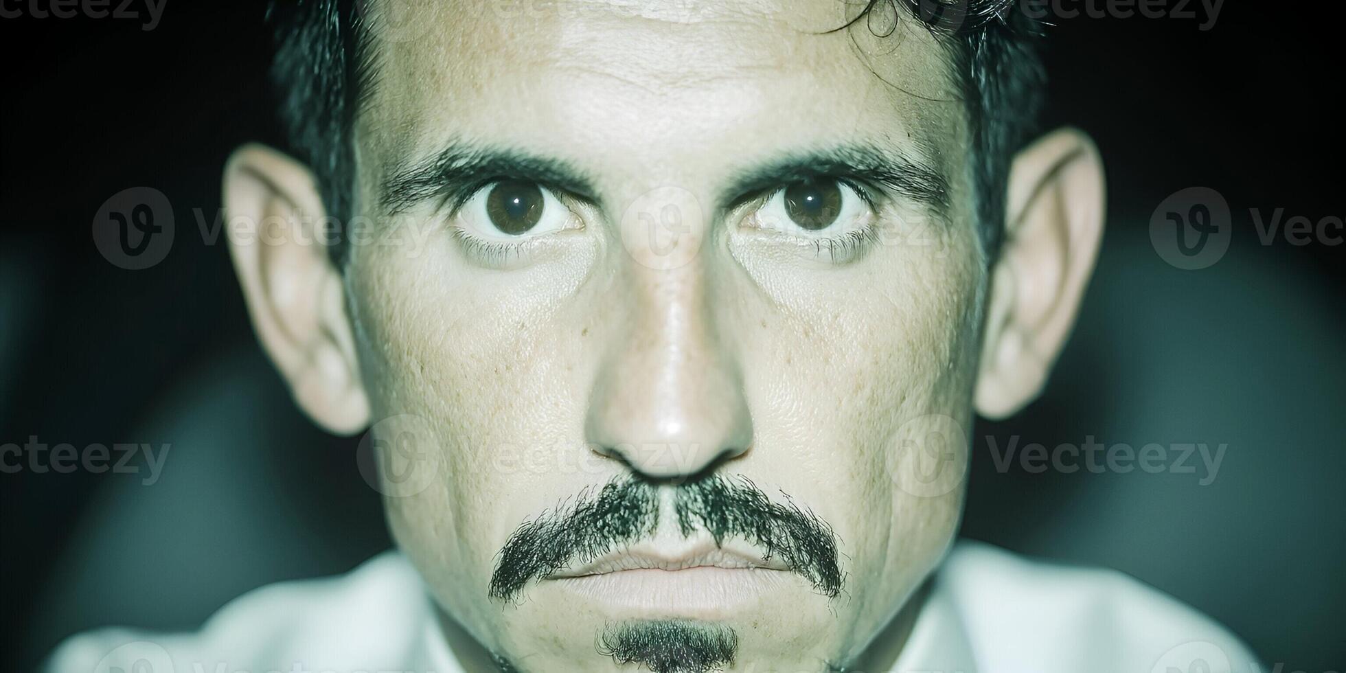 A mans face with a mustache and goatee stares directly forward with an intense expression in a close up portrait Pro Photo