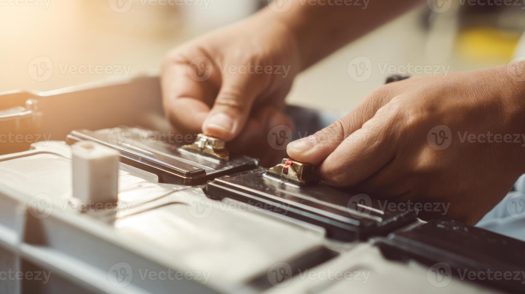 A close-up of a male technician working on a battery, focusing on connection terminals with a warm light in the background. Pro Photo