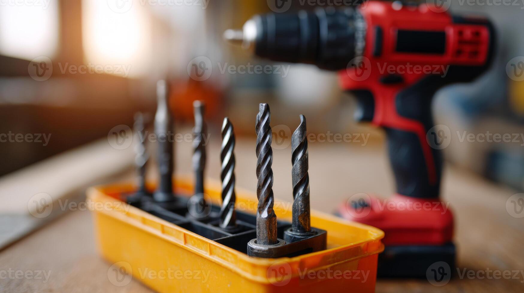 Close-up of a cordless drill and metal drill bits in a yellow container, showcasing a workspace filled with tools. Pro Photo