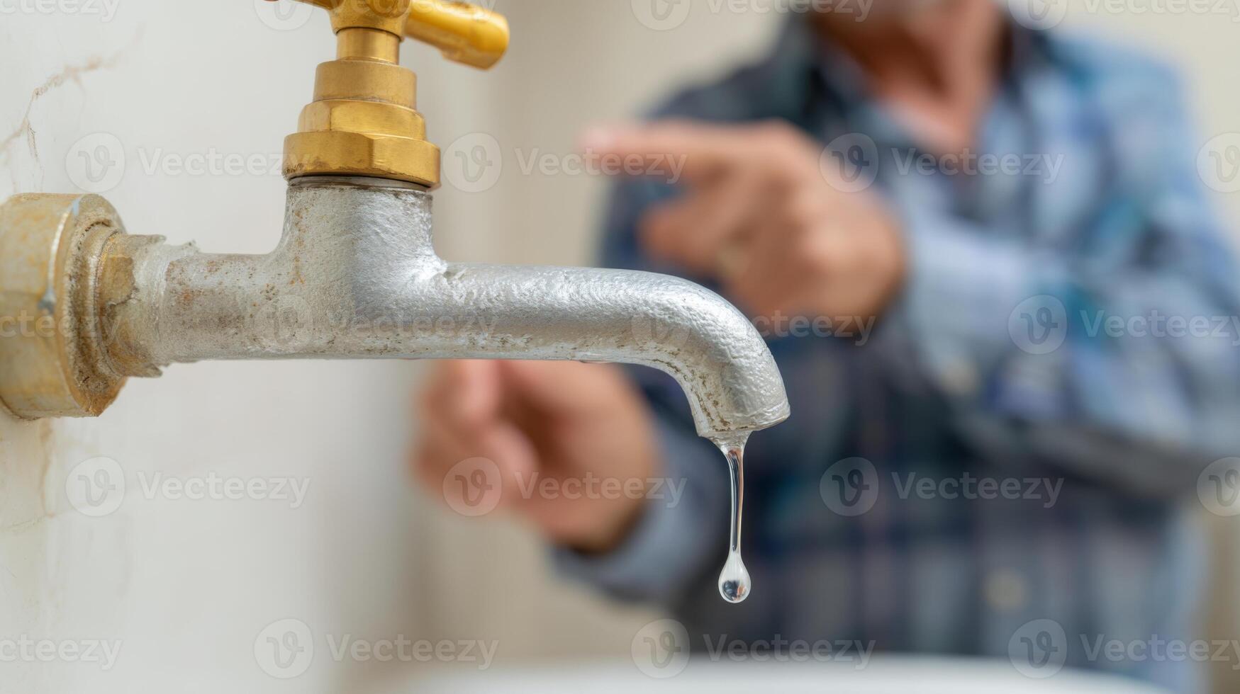 Close-up of a dripping faucet with an elderly man's hand gesturing in the background, emphasizing the need for repairs. Pro Photo