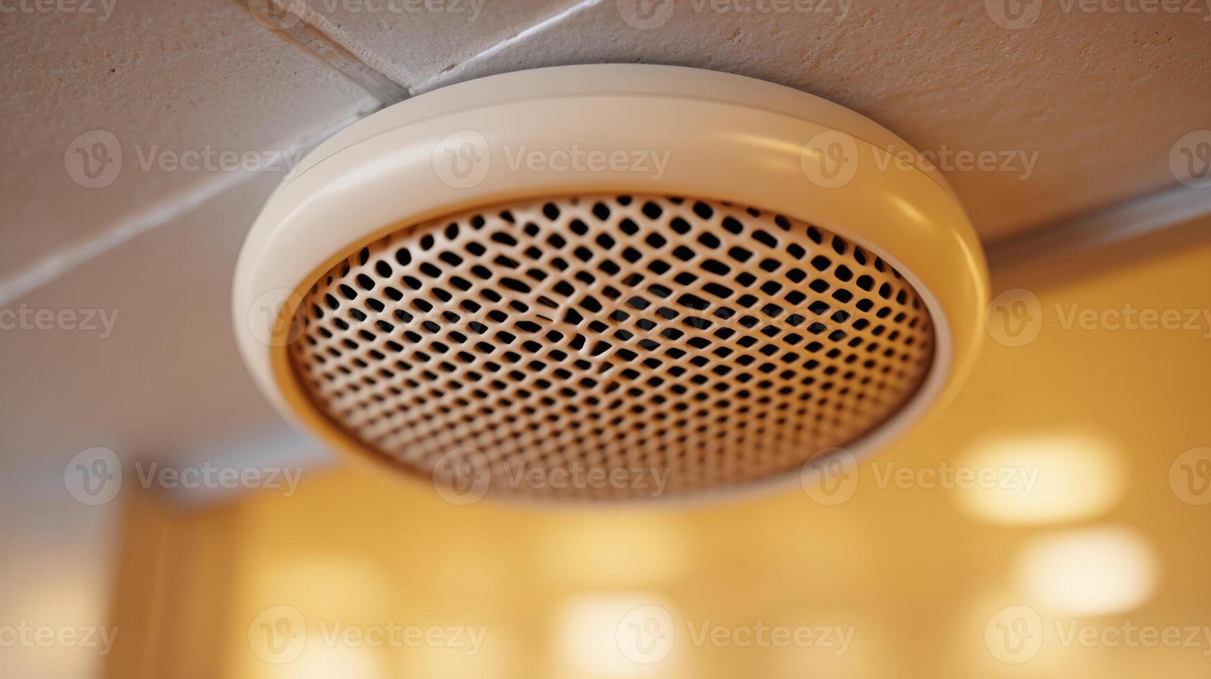 Close-up of a round ceiling speaker showcasing its intricate mesh design, blending seamlessly with the modern interior. Pro Photo