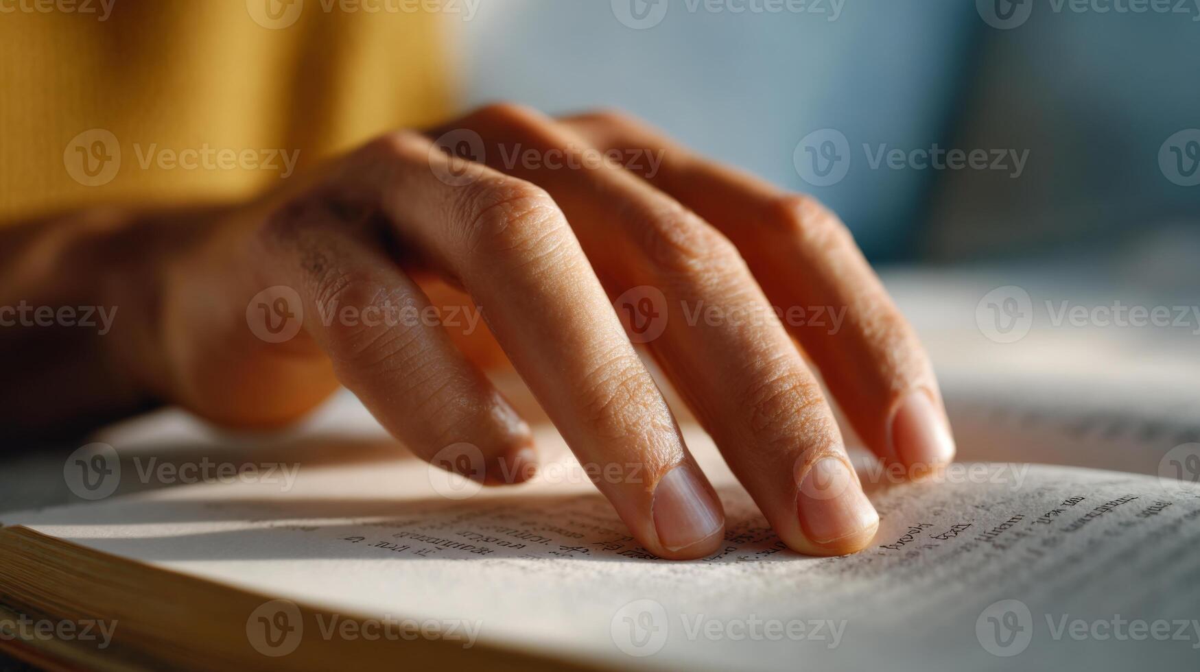 A close-up of a hand gently tracing the lines of an open book, evoking a sense of calm and introspection. Pro Photo