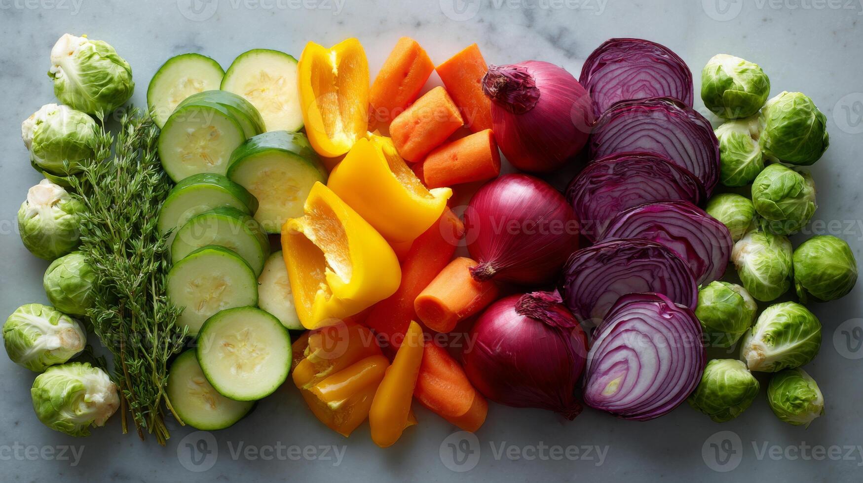 A vibrant array of fresh vegetables, including cucumbers, carrots, red onions, and Brussels sprouts, arranged artfully on a marble surface. Pro Photo