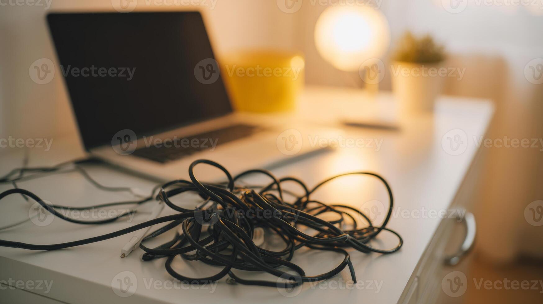 A cluttered workspace with tangled cables in the foreground, and a laptop and lamp softly illuminated in the background. Pro Photo